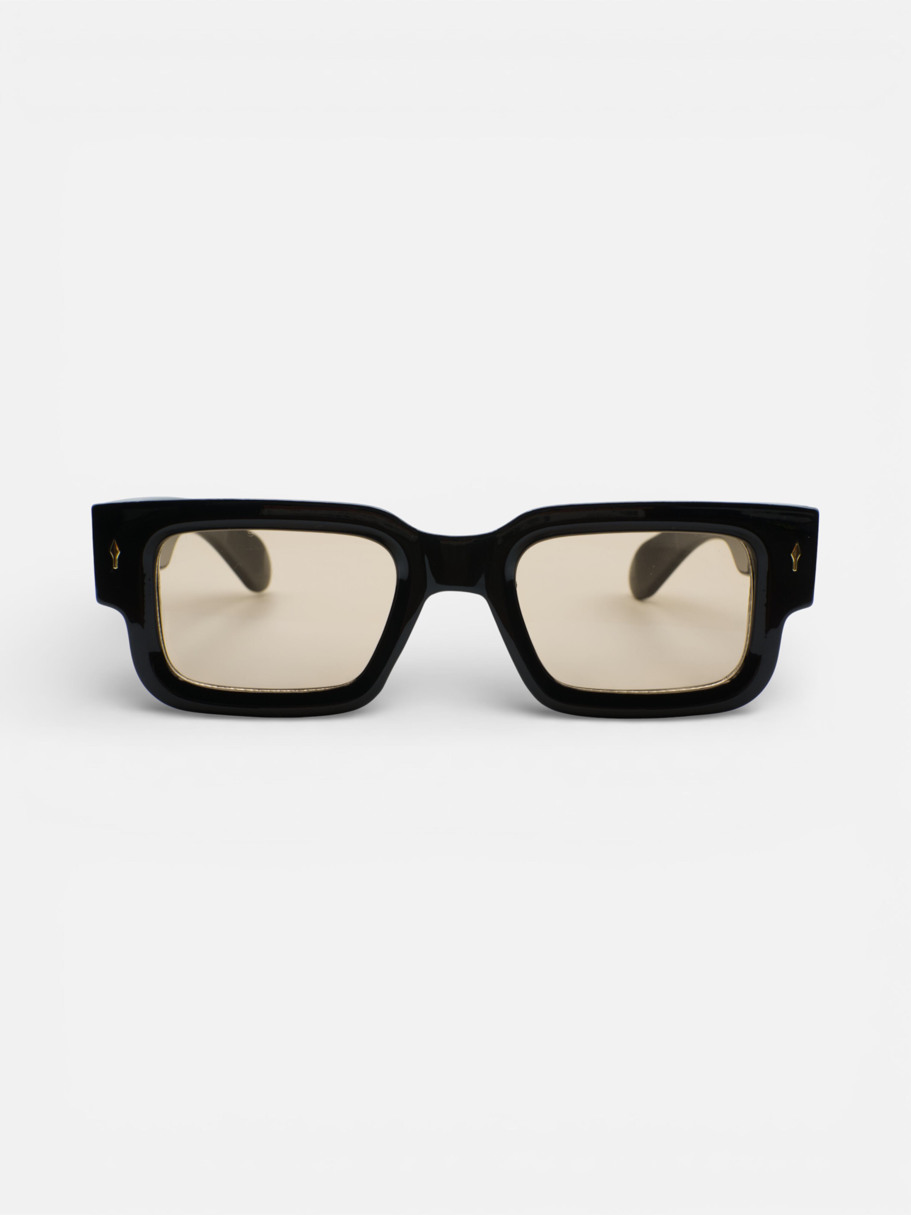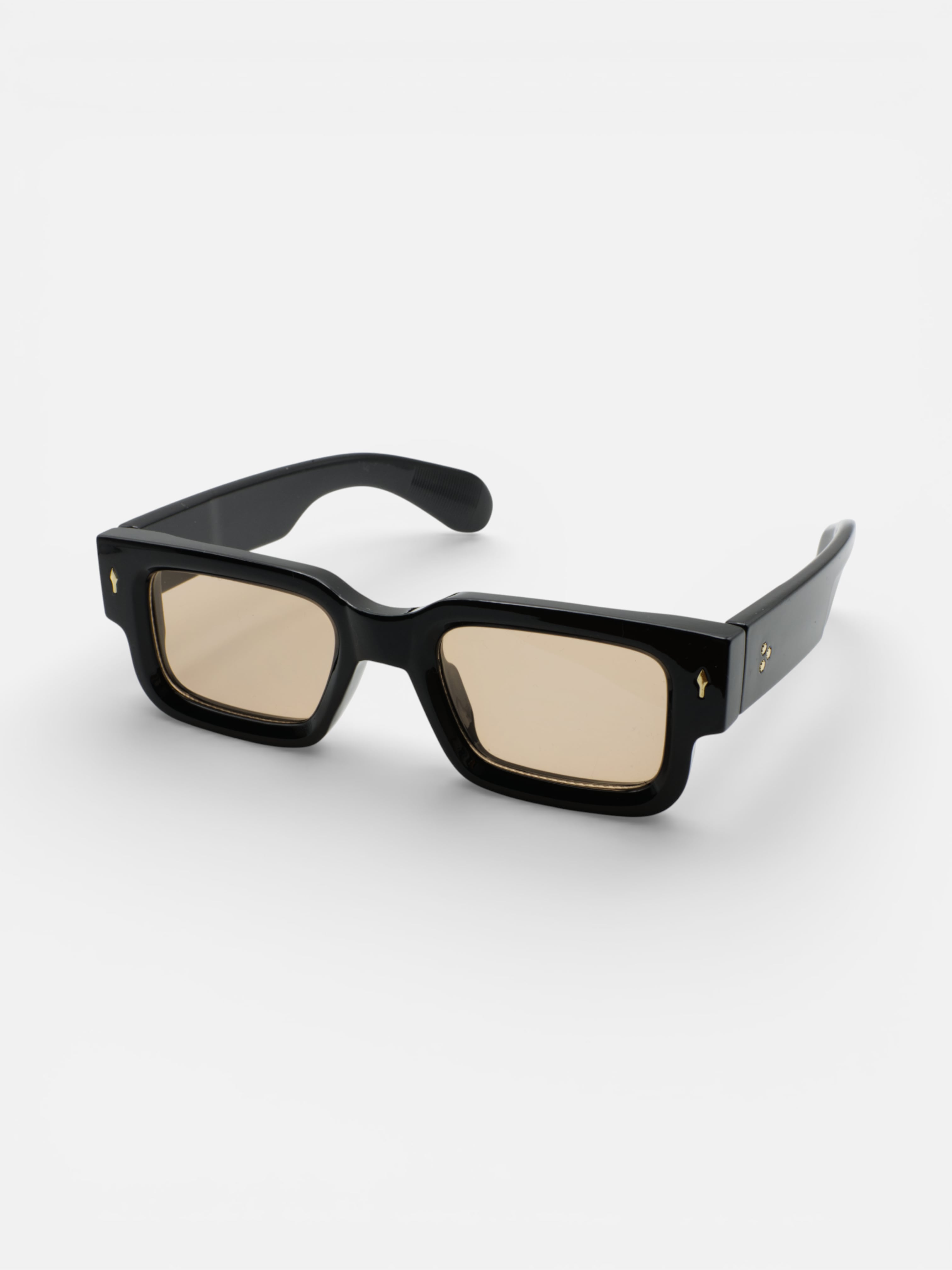 商品説明:あえてエッジを効かせたボリューミーなリムデザインが、クラシックでありながらも力強い個性を主張します。フロントに配されたゴールドの飾り鋲(リベット)が、黒の重厚感の中で繊細なアクセントとなり、視線を惹きつけるラグジュアリーなスパイスとして機能しています。